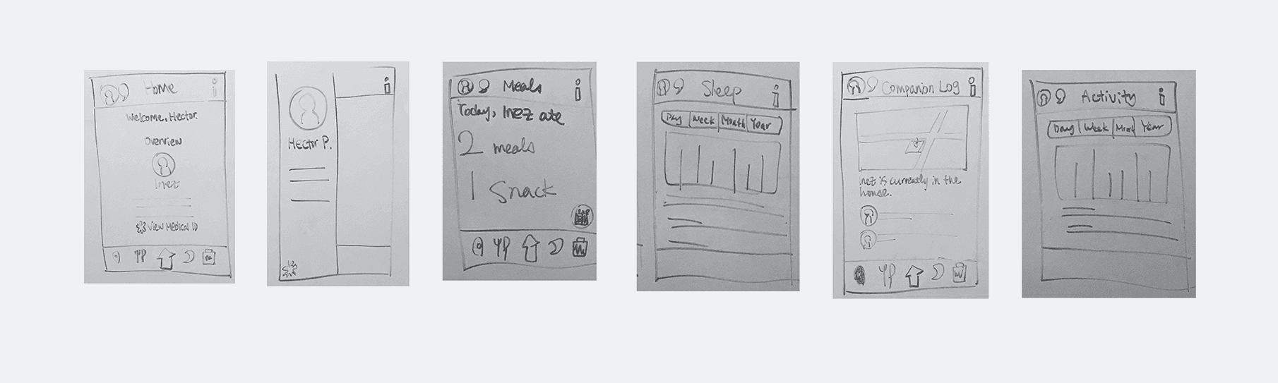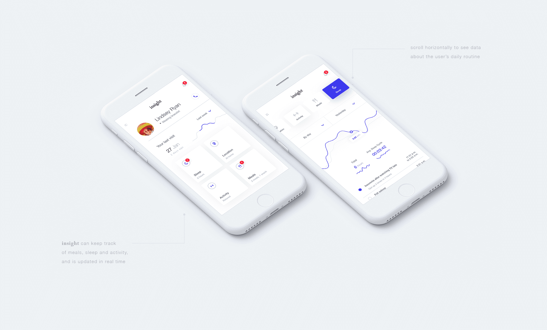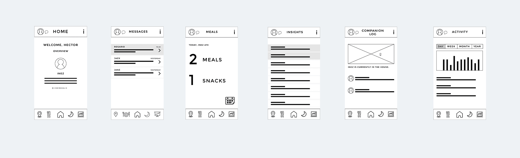 Based on insights we gained from our research, we generated exploratory scenarios that describe how the app might deliver value to the two personas. How could mobile technology fill some of these needs? We started by thinking of all the data we can gather and how we could track the progress of the disease and recognize new symptoms from that data. After a few iterations, we also decided to add a way to connect Hector and Inez so that they could communicate easily and discuss Inez's long-term mental health trends.