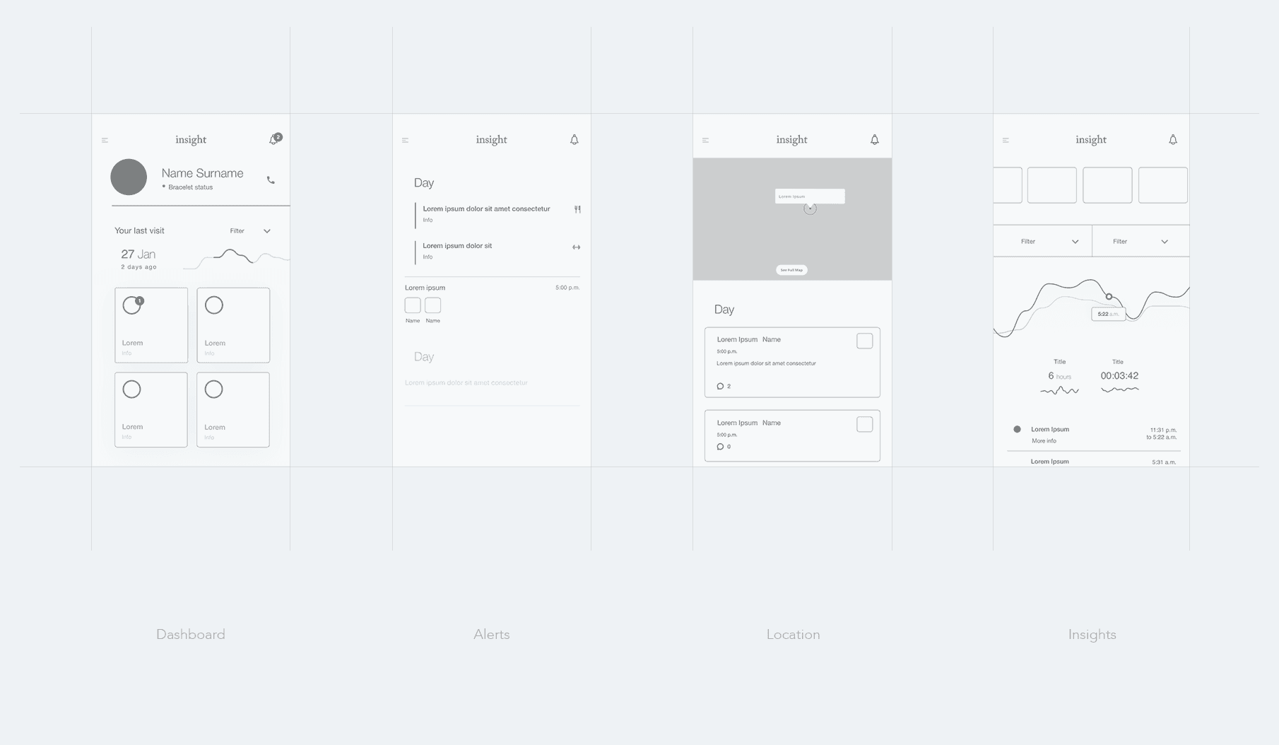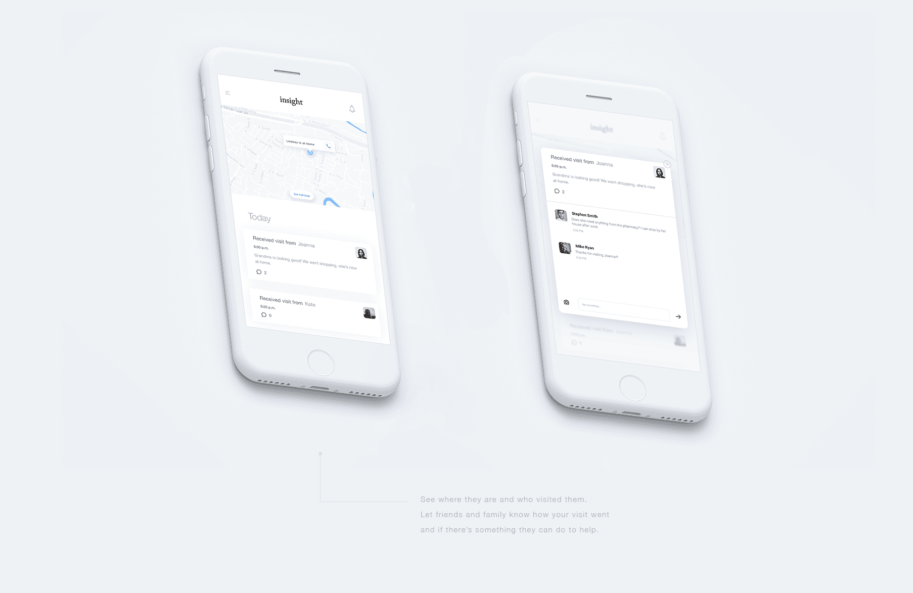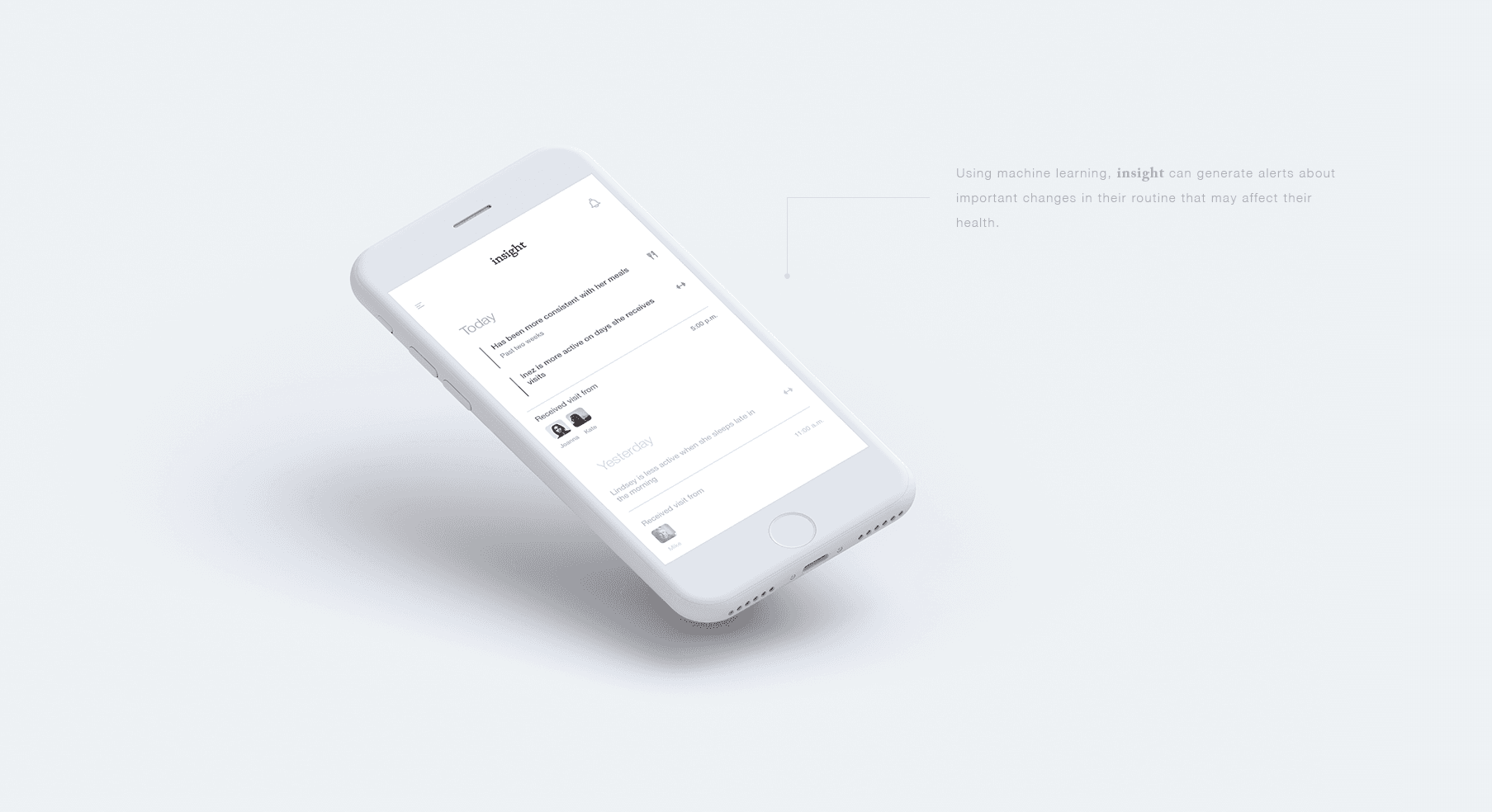 Based on insights we gained from our research, we generated exploratory scenarios that describe how the app might deliver value to the two personas. How could mobile technology fill some of these needs? We started by thinking of all the data we can gather and how we could track the progress of the disease and recognize new symptoms from that data. After a few iterations, we also decided to add a way to connect Hector and Inez so that they could communicate easily and discuss Inez's long-term mental health trends.